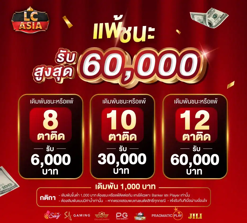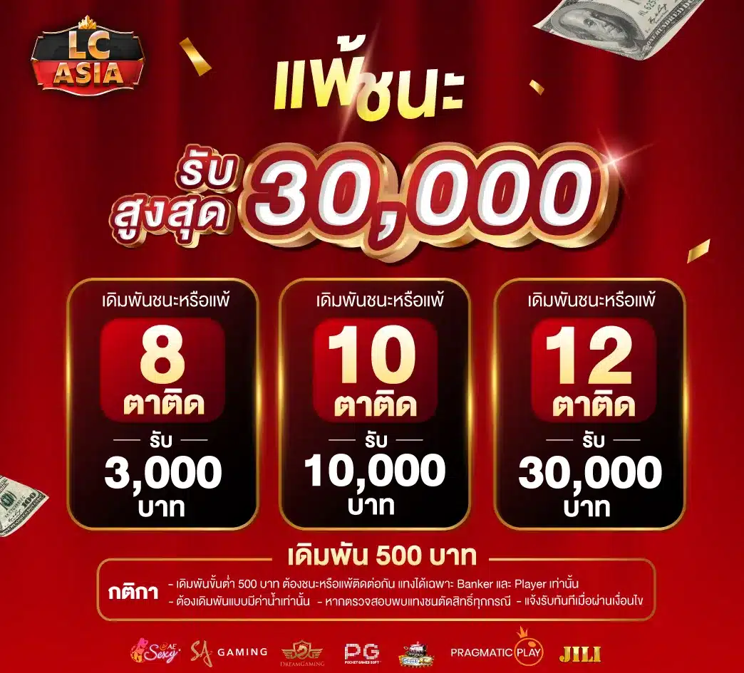 – เดิมพันขั้นต่ำ 1,000 บาท ต้องชนะหรือแพ้ติดต่อกัน แทงได้เฉพาะ Banker และ Player เท่านั้น